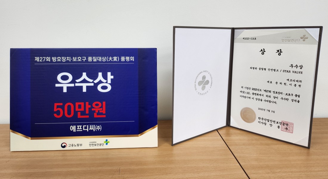 27회 방호장치·보호구 품질대상 품평회 수상 페이지 정보 작성자 관리자 조회Hit 355회 작성일Date 23-07-06 14:31 본문 에프디씨(주)가 제 27회 방호장치·보호구 품질대상(大賞) 품평회에서 우수상을 수상하였습니다. 목록