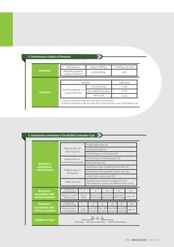 Burst testLeak test* It shall be conducted a leak test under 90% of set pressure* It shall be conducted a leak test under 50% of set pressure in case of Flat/Slotted Type.Nominal diameter of rupture disc(mm)Division Soak time1 min2 min5 min50 and belowabove 50&100 and belowabove 100Set PressureAllowable range of rupture Pressure %u00b10.015MPag %u00b15%below 0.3MPag 0.3MPag and overRupture disc of dome type (C)Single plate type (O)Composite type (C)Carved type or cutout type (S)Carved type or shearing type (S)Self-knife type (K)Exchanger type graphite rupture disc (R)Monoblock type graphite rupture disc (M)Cutout type rupture disc (S)Rupture discs produced depend on the manufacturers which are different than above.Rupture disc of inverted dome type(R)Rupture disc of flat type(F)Other type (X)Division inaccordance with structureDivision in accordance with nominal diameterDivision in accordance with nominal pressureNotation of typeRange of nominal diameter(mm)25 and belowDivision of nominal diameter I II III IV Vabove 25 & 50 and below above 50 & 80 and below above 80 & 100 and below above 100Range of rupture pressure(MPag)1 3 5 10 21 22 Division of nominal pressure1 and belowabove 1&3 and below above 3&5 and below above 5&10 and below above 10&21and below above 21RS II 3Structure Nominal Diameter Nominal pressureFDC BROCHURE | 10 | 11 |5. Performance Criteria of Products6. Classification and Notation of the KOSHA Certification Type
