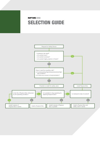 YesYes YesYesYesNoNoNoNo NoRequest for Safety DeviceIs pressure rise rapid?or Is content toxic?or Is content corrosive?or Is content highly polymer or frozen?Does it need the massflow rate?or Is pressure(low/high)/temperature(low/high) bad condition?or Is there any concern of polymerization?Possible to install the safety valve Install Rupture DiscIs the life of Rupture Disc influencedby the operating condition?Is it possible to stop operating forreplacing Rupture Disc? Is it allowed to leak of content?Install 2 pieces of Rupture Disc in series Install a Rupture Disc Install 2 pieces of Rupture Disc in parallelInstall a Rupture Disc and safety valve in seriesRUPTURE DISCSELECTION GUIDE