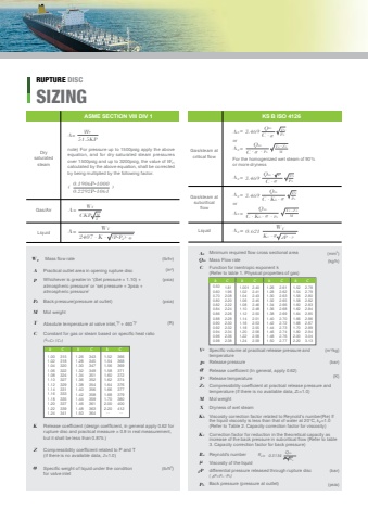 ASME SECTION VIII DIV 1 KS B ISO 4126For the homogenized wet steam of 90% or more drynessnote) For pressure up to 1500psig apply the above equation, and for dry saturated steam pressures over 1500psig and up to 3200psig, the value of WT, calculated by the above equation, shall be corrected by being multiplied by the following factor.Dry saturated steamGas/AirLiquidWTPdPAMTKCZ(lb/hr)(psia)(psia)(R)(in2)Constant for gas or steam based on specific heat ratio(k=CP /CV)1.001.021.041.061.081.101.121.141.161.181.201.221.243153183203223243273293313333353373393411.261.281.301.321.341.361.381.401.421.441.461.481.503433453473493513523543563583593613633641.521.541.561.581.601.621.641.661.681.702.002.20366368369371372374376377379380400412k C k C k C... ...(lb/ft3 %u03c9 )Mass flow ratePractical outlet area in opening rupture disc Whichever is greater in %u2018(Set pressure %u00d7 1.10) + atmospheric pressure%u2019 or %u2018set pressure + 3psia + atmospheric pressure%u2019Back pressure(pressure at outlet)Mol weightAbsolute temperature at valve inlet,%u2109+ 460%u2109Release coefficient (design coefficient, in general apply 0.62 for rupture disc and practical measure %u00d7 0.9 in real measurement, but it shall be less than 0.875.)Compressibility coefficient related to P and T(if there is no available data, Z=1.0)Specific weight of liquid under the condition for valve inlet Gas/steam at critical flowGas/steam at subcriticalflowLiquidA0CQm%u03b1V0Z0MKbKvRePbXT0P0(mm2)(kg/h)(m3/kg)(psia)(bar)(bar)(K)0.500.600.700.800.820.840.860.880.900.920.940.960.981.811.962.082.202.222.242.262.282.302.322.342.362.381.0011.021.041.061.081.101.121.141.161.181.201.221.241.521.541.561.581.601.621.641.661.681.701.802.002.202.402.412.432.452.462.482.502.512.532.552.562.582.592.782.792.802.822.832.842.852.862.872.892.943.043.131.261.281.301.321.341.361.381.401.421.441.461.481.502.612.622.632.652.662.682.692.702.722.732.742.762.77k C k C k C k CRe= 0.3134QmA0P%u00b5Minimum required flow cross sectional areaMass Flow rateFunction for isentropic exponent k(Refer to table 1. Physical properties of gas)Specific volume at practical release pressure and temperatureRelease pressureRelease coefficient (In general, apply 0.62)Release temperatureCompressibility coefficient at practical release pressure and temperature (If there is no available data, Z0=1.0)Mol weightDryness of wet steamCorrection factor for reduction in the theoretical capacity as increase of the back pressure in subcritical flow (Refer to table 3. Capacity correction factor for back pressure)Viscosity correction factor related to Reynold's number(Re) If the liquid viscosity is less than that of water at 20%u00b0C, kv=1.0 (Refer to Table 2. Capacity correction factor for viscosity)Reynold's numberViscosity of the liquid( P=Po -Pb)differential pressure released through rupture discBack pressure (pressure at outlet)RUPTURE DISCSIZING51.5KPWT A=0.1906P-1000 ( )0.2292P-1061WT A=ckp tmWT A= 2407 . k . (p-pd ). %u03c9A0 = 3.469 C . kb . %u03b1qmp0v0A0 = C . kb . %u03b1. p0qmmt0 .z0orA0 = 3.469 C . %u03b1qmp0v0A0 = C . %u03b1. p0qmmt0 .z0orA0 = 3.469 p0v0C . %u03b1qm . xWT A0 = 0.621kv . %u03b1 p . p