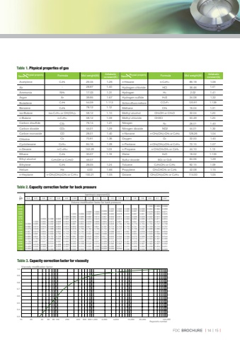 Acetylene n-HexaneHydrogenMethaneNitrogenOxygenHydrogen chlorideDichloro difluoro methaneAirArgonAmmoniaCarbon disulfideHydrogen sulfideCarbon dioxideCarbon monoxideEthyl alcoholn-HeptaneCyclohexaneEthyleneiso-Butanen-Butanen-DecaneEthaneBenzeneChlorineButadieneC2H2 26.04 1.26 n-C6H14 86.18 1.06CO 28.01 1.40 n-CH3(CH2)7CH3 or C9H20 128.26 1.04C6H6 78.12 1.12 CH4 16.04 1.31Sulfur dioxidePropyleneC2H5OH or C2H6O 46.07 - SO2 or O2S 64.06 1.29- 28.97 1.40 HCl 36.46 1.41Cl2 70.91 1.36 O2 32.00 1.40iso-C4H10 or CH(CH3)3 58.12 1.10 CH3OH or CH4O 32.04 1.20C2H4 28.05 1.24 C6H5CH3 or C7H8 92.15 1.09Ar 39.95 1.67 H2S 34.08 1.32n-PropaneWatern-C10H22 142.29 1.03 n-CH3CH2CH3 or C3H8 44.10 1.13CS2 76.14 1.21 N2 28.01 1.40n-CH3(CH2)5CH3 or C7H16 100.21 1.05 CH3(CH2)6CH3 or C8H18 114.00 1.05NH3 17.03 1.31 H2 2.02 1.41C6H12 84.16 1.09 n-CH3(CH2)3CH3 or C5H12 72.15 1.07Methyl chlorideNitrogen dioxiden-C4H10 58.12 1.09 CH3Cl 50.49 1.20Helium He 4.00 1.66 CH3CHCH2 or C3H6 42.08 1.15C4H6 54.09 1.113 CCl2F2 120.91 1.139C2H6 30.07 1.19 H2O 18.02 1.133CO2 44.01 1.29 NO2 44.01 1.30P0PbIsentropic exponent(k)Volume modification factor for back pressure0.450.500.550.600.650.700.750.800.820.840.860.880.900.920.940.960.981.001.0000.9850.9700.9480.9190.8810.8310.7690.6870.5790.4220.0000.9990.9950.9650.9440.9170.8840.8420.7910.7270.6470.5420.3930.0000.9990.9830.9420.9180.8880.8520.8090.7570.6930.6140.5130.3710.0000.9930.9680.9210.8940.8620.8000.7800.7280.6640.5870.4890.3530.0000.9990.9850.9530.9000.8720.8390.7790.7550.7030.6400.5650.4690.3370.0001.0000.9950.9750.9380.8810.8520.8180.7590.7330.6810.6190.5450.4520.3250.0000.9990.9890.9640.9230.8640.8330.7990.7420.7140.6620.6010.5280.4380.3140.0000.9990.9970.9820.9530.9090.8470.8170.7820.7270.6970.6450.5850.5140.4250.3050.0001.0000.9930.9740.9430.8960.8330.8010.7660.7120.6820.6310.5710.5010.4140.2960.0000.9990.9890.9710.9450.9090.8540.8080.7390.7070.6720.6340.5920.5440.4900.4280.3520.2510.0000.9990.9920.9750.9500.9150.8710.8150.7470.7150.6800.6410.5990.5510.4970.4340.3570.2540.0001.0000.9940.9790.9550.9220.8790.8240.7550.7230.6880.6490.6060.5580.5040.4400.3620.2580.0000.9960.9830.9610.9290.8860.8320.7640.7320.6970.6580.6150.5660.5110.4460.3670.2620.0000.9990.9870.9670.9360.8950.8410.7730.7410.7060.6670.6240.5750.5190.4530.3730.2660.0000.9990.9910.9720.9440.9030.8510.7830.7520.7160.6670.6330.5840.5270.4610.3800.2710.0001.0000.9940.9780.9510.9130.8610.7940.7530.7270.6770.6440.5940.5370.4700.3870.2770.0001.0000.9970.9830.9590.9220.8720.8060.7740.7390.6880.6550.6050.5470.4790.3950.2820.0000.9990.9890.9670.9320.8840.8190.7870.7520.7000.6880.6170.5590.4890.4040.2890.0000.9990.9920.9790.9570.9240.8800.8200.7390.6280.4260.0000.4 0.5 0.6 0.7 0.8 0.9 1.001 1.1 1.2 1.3 1.4 1.5 1.6 1.7 1.8 1.9 2.0 2.1 2.2Reynold%u2019s numberViscosity modification factor 1.00.90.80.70.60.50.40.310 20 40 60 80 100 200 400 600 800 1,000 2,000 4,000 10,000 20,000 100,000Methyl alcoholn-Nonanen-PentaneTolueneOctaneFDC BROCHURE | 14 | 15 |Table 1. Physical properties of gasMol weight(M) Physial property Name Formula Adiabatic constant(K) Mol weight(M) Physial property Name Formula Adiabatic constant(k)Table 2. Capacity correction factor for back pressureTable 3. Capacity correction factor for viscosity