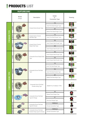 Gas or Vapor LiquidFSBFFSSSSDFDBFRFFFFERRULEFERRULEMaxOperating Ratio5 ~ 700 kg/%u33a015 ~ 1,500 kg/%u33a0Set. Pressure15 ~ 1,500 kg/%u33a00.1 ~ 30 kg/%u33a01.0 ~ 560 kg/%u33a00.05 ~ 50 kg/%u33a080%Forward Dome Scored TypeForward Dome Tension Sloped Seat TypeForward Dome Tension Flat Seat TypeSpark FragmentYesAvailable Service PhaseYes Yes NoNo Yes Yes No No 80%No Yes Yes No Yes 70%Yes or No Yes Yes No Yes 70%NoYes Yes Yes No No 80%Yes Yes Yes No No 80%Yes Yes Yes No No 80%Yes Yes Yes No No 80%Vacuum SupportRequired Description DrawingKSRST KSRCT KSRC KSRRCH KSRRCHD KSRRC KSRRCF KSRRCFD KSRSFModel(Image)FSSSSDCOMPOSITE DOME TYPE FORWARD TYPEHolderor Connection TypeInsert Flat Seat Single TypeBolted Flat Seat Single TypeInsert Flat Seat Single TypeInsert Sloped Seat Single TypeInsert Sloped Seat Double TypeFLOWFLOWFLOWFLOWFLOWSize1/2\(15A ~ 1300A)1S~4SFERRULE1S~4SFERRULE1/2\(15A ~ 300A)1/4\(8A ~ 100A)1/2\(15A ~ 1200A)1/2\(15A ~ 1000A)1/2\(15A ~ 1000A)1/2\(15A ~ 1200A)1/4\(8A ~ 100A)Insert Sloped Seat Single TypeTeflonSealMetalSealInsert Sloped Seat Double TypeInsert Flat Seat Single TypeInsert Flat Seat Double TypeBolted Flat Seat Single TypeFerrule Connection TypeFerrule Connection TypeComposite Dome Sloped Seat TypeComposite Dome Flat Seat TypeComposite Dome Flat SeatType for FlangeComposite Dome Flat SeatType for FerruleComposite Dome Flat SeatDouble Acting Type for FerruleFLOWFLOWFLOWFLOWFLOWFlat Face Flange TypeFLOWRaised Face Flange TypeFLOWFLOWFLOWFLOW0.05 ~ 50 kg/%u33a00.3 ~ 15 kg/%u33a00.3 ~ 15 kg/%u33a0RUPTURE DISCINSERT FLAT SINGLE TYPE 0.05 ~ 50 kg/%u33a0 No 80% Composite Dome Flat Seat Double Acting TypeYes Yes Yes No1/2\(15A ~ 1200A)FLOWFLOWPRODUCTS LIST