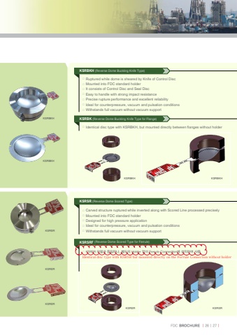 %u25a0 Ruptured while dome is sheared by Knife of Control Disc%u25a0 Mounted into FDC standard holder%u25a0 It consists of Control Disc and Seal Disc%u25a0 Easy to handle with strong impact resistance%u25a0 Precise rupture performance and excellent reliability%u25a0 Ideal for counterpressure, vacuum and pulsation conditions%u25a0 Withstands full vacuum without vacuum support%u25a0 Identical disc type with KSRBKH, but mounted directly between flanges without holderKSRBKH (Reverse Dome Buckling Knife Type)KSRBK (Reverse Dome Buckling Knife Type for Flange)%u25a0 Carved structure ruptured while inverted along with Scored Line processed precisely%u25a0 Mounted into FDC standard holder%u25a0 Designed for high pressure application%u25a0 Ideal for counterpressure, vacuum and pulsation conditions%u25a0 Withstands full vacuum without vacuum supportKSRSR (Reverse Dome Scored Type)KSRBKHKSRSR KSRSRKSRBKHKSRBKH KSRBKHFDC BROCHURE | 26 | 27 |%u25a1 KSRSR %ubaa8%ub378%uacfc %ub3d9%uc77c%ud558%ub098, %ubcc4%ub3c4%uc758 Holder %uc5c6%uc774 Ferrule Connection%uc5d0 %uc124%uce58%ud558%uc5ec %uc0ac%uc6a9KSRSRF (Reverse Dome Scored Type for Ferrule)KSRSRKSRSRKSRSRIdentical disc type with KSRSR but mounted directly on the Ferrule Connection without holder