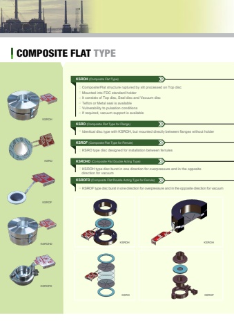 COMPOSITE FLAT TYPE%u25a0 Composite/Flat structure ruptured by slit processed on Top disc%u25a0 Mounted into FDC standard holder%u25a0 It consists of Top disc, Seal disc and Vacuum disc%u25a0 Teflon or Metal seal is available%u25a0 Vulnerability to pulsation conditions%u25a0 If required, vacuum support is available%u25a0 Identical disc type with KSROH, but mounted directly between flanges without holderKSRO (Composite Flat Type for Flange)%u25a0 KSRO type disc designed for installation between ferrulesKSROF (Composite Flat Type for Ferrule)%u25a0 KSROF type disc burst in one direction for overpressure and in the opposite direction for vacuumKSROFD (Composite Flat Double Acting Type for Ferrule)%u25a0 KSROH type disc burst in one direction for overpressure and in the opposite direction for vacuumKSROHD (Composite Flat Double Acting Type)KSROH (Composite Flat Type)KSROHKSROHKSROKSROHKSROFKSROFKSROHDKSROFDKSRO