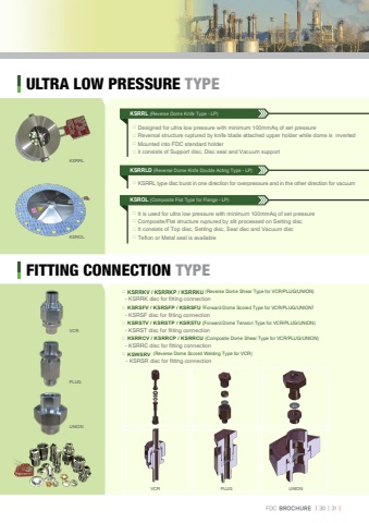 %u25a0 KSRRKV / KSRRKP / KSRRKU (Reverse Dome Shear Type for VCR/PLUG/UNION) - KSRRK disc for fitting connection%u25a0 KSRSFV / KSRSFP / KSRSFU (Forward Dome Scored Type for VCR/PLUG/UNION) - KSRSF disc for fitting connection%u25a0 KSRSTV / KSRSTP / KSRSTU (Forward Dome Tension Type for VCR/PLUG/UNION) - KSRST disc for fitting connection%u25a0 KSRRCV / KSRRCP / KSRRCU (Composite Dome Shear Type for VCR/PLUG/UNION) - KSRRC disc for fitting connection%u25a0 KSWSRV (Reverse Dome Scored Welding Type for VCR) - KSRSR disc for fitting connection%u25a0 Designed for ultra low pressure with minimum 100mmAq of set pressure%u25a0 Reversal structure ruptured by knife blade attached upper holder while dome is inverted %u25a0 Mounted into FDC standard holder%u25a0 it consists of Support disc, Disc seal and Vacuum support%u25a0 KSRRL type disc burst in one direction for overpressure and in the other direction for vacuum%u25a0 It is used for ultra low pressure with minimum 100mmAq of set pressure%u25a0 Composite/Flat structure ruptured by slit processed on Setting disc%u25a0 It consists of Top disc, Setting disc, Seal disc and Vacuum disc%u25a0 Teflon or Metal seal is availableKSRRL (Reverse Dome Knife Type - LP)KSRRLD (Reverse Dome Knife Double Acting Type - LP)KSROL (Composite Flat Type for Flange - LP)ULTRA LOW PRESSURE TYPEFITTING CONNECTION TYPEKSROLKSRRLVCRPLUGPLUG UNIONUNIONVCRFDC BROCHURE | 30 | 31 |