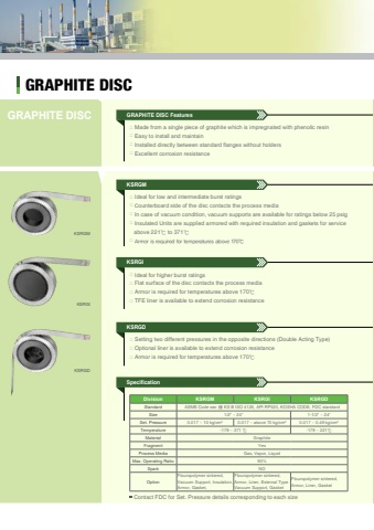 GRAPHITE DISC%u25a0 Made from a single piece of graphite which is impregnated with phenolic resin%u25a0 Easy to install and maintain%u25a0 Installed directly between standard flanges without holders%u25a0 Excellent corrosion resistanceGRAPHITE DISC Features %u25a0 Ideal for low and intermediate burst ratings%u25a0 Counterboard side of the disc contacts the process media%u25a0 In case of vacuum condition, vacuum supports are available for ratings below 25 psig%u25a0 Insulated Units are supplied armored with required insulation and gaskets for service above 221%u2103 to 371%u2103%u25a0 Armor is required for temperatures above 170%u2103KSRGM%u25a0 Ideal for higher burst ratings%u25a0 Flat surface of the disc contacts the process media%u25a0 Armor is required for temperatures above 170%u2103%u25a0 TFE liner is available to extend corrosion resistanceKSRGI%u25a0 Setting two different pressures in the opposite directions (Double Acting Type)%u25a0 Optional liner is available to extend corrosion resistance%u25a0 Armor is required for temperatures above 170%u2103KSRGDSpecificationGRAPHITE DISC Division KSRGM KSRGI KSRGDStandard ASME Code sec %u2167 KS B ISO 4126, API RP520, KOSHA CODE, FDC standardSize 1/2\1-1/2\Set. Pressure 0.017 ~ 10 kg/cm%u00b2 0.017 ~ above 70 kg/cm%u00b2 0.017 ~ 0.49 kg/cm%u00b2Temperature -179 ~ 371 %u2103 -179 ~ 221%u2103Material GraphiteFragment YesProcess Media Gas, Vapor, LiquidMax. Operating Ratio 90%Spark NOOptionFlouropolymer sintered,Vacuum Support, Insulation,Armor, Gasket, Flouropolymer sintered,Armor, Liner, External TypeVacuum Support, GasketFlouropolymer sintered,Armor, Liner, GasketKSRGDContact FDC for Set. Pressure details corresponding to each sizeKSRGMKSRGI