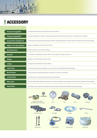 ACCESSORYPressure Gauge(P/G) A measurement device which determines the pressurePressure Switch(P/S) A device designed to monitor a process pressure and provide an output when a set pressure is reachedExcess Flow Valve(E.F.V) A kind of check valve maintaining atmospheric pressure in the space between the rupture disc and the relief valve with a pressure gaugeNipple, Tee, Plug, Reducer Fitting for installation of P/G, P/S and E.F.V.Stud Bolt & Nut Tightening bolt & nut for In/Out FlangeJack Screw It provides safe and easy installation of rupture discs by separating Inlet/Outlet flangesGasket Sealing of In/Out Flange mating surfaceJunction Box Terminal box for connecting shield cable of burst sensorEye Bolt A bolt which is attached to heavy holder so that ropes or cables are tied to itBurst Sensor A burst indicator providing instantaneous notification of rupture disc activationJ-Hook J-shaped hooks installed at lower HolderRain Hood It protects Rupture Disc against foreign objects or rain inflow by installed onto downstream of the Rupture Disc exposed to the atmosphereHeat Shield Heat shield such as cerakwool and aerogel is attached to disc and helps disc to withstand the high temperatureJack Screw Burst Sensor Junction Box Rain HoodStud Bolt & Nut Eye Bolt Gasket J-HookRupture Disc Ass%u2019ywith P/G & E.F.V & Fitting P/G P/S E.F.V Reducer