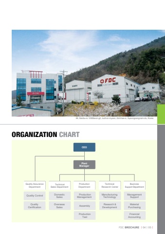 ORGANIZATION CHART99, Seobu-ro 1293beon-gil, Juchon-myeon, Gimhae-si, Gyeongsangnam-do, KoreaFDC BROCHURE | 04 | 05 |Quality Assurance DepartmentPlant ManagerCEOQuality Control Quality CertificationTechnicalSales DepartmentDomesticSalesOverseas SalesProduction Department Production ManagementAssemblyProductionTestTechnical Research CenterManufacturing TechnologyResearch & DevelopmentBusiness Support DepartmentManagement SupportMaterial PurchasingFinancial Accounting