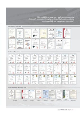 %u201cFDC would like to jump into a leading position among the world%u2019s companies through providing of high quality products, continuous R&D and management innovation%u201dFDC BROCHURE | 06 | 07 |Registration CertificatesIntellectual PropertiesType Certification of Rupture DiscReceived 14 KOSHA Safety Type Certification extraRenamed to FDC Co.,LTD.Established R&D CenterWon an excellence award from KOSHA Protection Device Quality AwardParticipated in Development Project of 20 Core Parts and Materials National Project of the Ministry of Knowledge EconomySelected as a Patent Star Company - Korean Intellectual Property Office/The Korea Chamber of Commerce & IndustryAppointed as a promising small & medium enterprise for export - Small and Medium Business AdministrationBuilt up the room temperature test facilityKOSHA CE-ATEX IEC-EX CSEL CE-PED GOSTASME UD CERTIFICATENBBI CERTIFICATE TRCU-COC