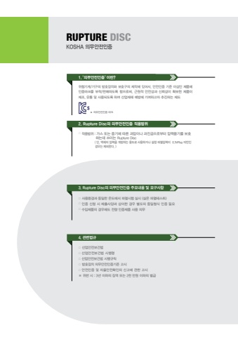 %u25a0 %uc801%uc6a9%ubc94%uc704 : %uac00%uc2a4 %ub610%ub294 %uc99d%uae30%uc5d0 %ub530%ub978 %uacfc%uc555%uc774%ub098 %uacfc%uc9c4%uacf5%uc73c%ub85c%ubd80%ud130 %uc555%ub825%uc6a9%uae30%ub97c %ubcf4%ud638 %ud558%ub294%ub370 %uc4f0%uc774%ub294 Rupture Disc ( %ub2e8, %uc561%uccb4%uc758 %uc555%ub825%uc744 %uac1c%ubc29%ud558%ub294 %uc6a9%ub3c4%ub85c %uc0ac%uc6a9%ud558%uac70%ub098 %uc124%uc815 %ud30c%uc5f4%uc555%ub825%uc774 0.1MPag %ubbf8%ub9cc%uc778 %uacbd%uc6b0%ub294 %uc81c%uc678%ud55c%ub2e4. )2. Rupture Disc%uc758 %uc758%ubb34%uc548%uc804%uc778%uc99d %uc801%uc6a9%ubc94%uc704%uc704%ud5d8%uae30%uacc4/%uae30%uad6c%uc758 %ubc29%ud638%uc7a5%uce58%uc640 %ubcf4%ud638%uad6c%uc758 %uc81c%uc791%uc5d0 %uc788%uc5b4%uc11c, %uc548%uc804%uc778%uc99d %uae30%uc900 %uc774%uc0c1%uc778 %uc81c%ud488%uc5d0%uc778%uc99d%ub9c8%ud06c%ub97c %ubd80%ucc29/%ud310%ub9e4%ud558%ub3c4%ub85d %ud568%uc73c%ub85c%uc368, %uadfc%uc6d0%uc801 %uc548%uc804%uc131%uacfc %uc2e0%ub8b0%uc131%uc774 %ud655%ubcf4%ub41c %uc81c%ud488%uc774 %uc81c%uc870, %uc720%ud1b5 %ubc0f %uc0ac%uc6a9%ub418%ub3c4%ub85d %ud558%uc5ec %uc0b0%uc5c5%uc7ac%ud574 %uc608%ubc29%uc5d0 %uae30%uc5ec%ud558%uace0%uc790 %ucd94%uc9c4%ud558%ub294 %uc81c%ub3c41.%u2018%uc758%ubb34%uc548%uc804%uc778%uc99d%u2019 %uc774%ub780?%u25a0 %uc0ac%uc6a9%ud658%uacbd%uacfc %ub3d9%uc77c%ud55c %uc628%ub3c4%uc5d0%uc11c %ud30c%uc5f4%uc2dc%ud5d8 %uc2e4%uc2dc (%uc2e4%uc628 %ud30c%uc5f4%ud14c%uc2a4%ud2b8)%u25a0 %uc778%uc99d %uc2e0%uccad %uc2dc %uc81c%ucd9c%uc0ac%uc591%uacfc %uc0c1%uc774%ud55c %uacbd%uc6b0 %ubcc4%ub3c4%uc758 %ub3d9%uc77c%ud615%uc2dd %uc778%uc99d %ud544%uc694%u25a0 %uc218%uc785%uc81c%ud488%uc758 %uacbd%uc6b0%uc5d0%ub3c4 %uc804%ub7c9 %uc778%uc99d%uc81c%ud488 %uc0ac%uc6a9 %uc758%ubb343. Rupture Disc%uc758 %uc758%ubb34%uc548%uc804%uc778%uc99d %uc8fc%uc694%ub0b4%uc6a9 %ubc0f %uc694%uad6c%uc0ac%ud56d%u25a0 %uc0b0%uc5c5%uc548%uc804%ubcf4%uac74%ubc95%u25a0 %uc0b0%uc5c5%uc548%uc804%ubcf4%uac74%ubc95 %uc2dc%ud589%ub839%u25a0 %uc0b0%uc5c5%uc548%uc804%ubcf4%uac74%ubc95 %uc2dc%ud589%uaddc%uce59%u25a0 %ubc29%ud638%uc7a5%uce58 %uc758%ubb34%uc548%uc804%uc778%uc99d%uae30%uc900 %uace0%uc2dc%u25a0 %uc548%uc804%uc778%uc99d %ubc0f %uc790%uc728%uc548%uc804%ud655%uc778%uc758 %uc2e0%uace0%uc5d0 %uad00%ud55c %uace0%uc2dc%u203b %uc704%ubc18 %uc2dc : 3%ub144 %uc774%ud558%uc758 %uc9d5%uc5ed %ub610%ub294 2%ucc9c %ub9cc%uc6d0 %uc774%ud558%uc758 %ubc8c%uae084. %uad00%ub828%ubc95%uaddcRUPTURE DISCKOSHA %uc758%ubb34%uc548%uc804%uc778%uc99d%u25b6 %uc758%ubb34%uc548%uc804%uc778%uc99d %ub9c8%ud06c
