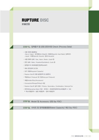 %u25a0 %uc0ac%uc6a9 %uc720%uccb4%uc758 %ubb3c%uc9c8%ud2b9%uc131 - Gas or Vapor : %ubd84%uc790%ub7c9(Mol Weight), %ube44%uc5f4%ube44(Specific Heat Ratio), %uc555%ucd95%uacc4%uc218 - Liquid : %ube44%uc911(Specific Gravity), %uc810%ub3c4(Viscosity) %u25a0 %uc0ac%uc6a9 %uc720%uccb4%uc758 %uc0c1%ud0dc : Gas, Vapor, Steam, Liquid %ub4f1%u25a0 %uc6b4%uc804 %uc0c1%ud0dc : Static, Pulsation(Oscillation), Cycle %ub4f1%u25a0 %uc555%ub825%uc6a9%uae30%uc758 %ucd5c%ub300%ud5c8%uc6a9%uc6b4%uc804%uc555%ub825(MAWP)%u25a0 %ucd5c%ub300 %uc6b4%uc804%uc555%ub825 %ubc0f %uc628%ub3c4%u25a0 %uc694%uad6c %uc720%ub7c9(Required Capacity)%u25a0 Rupture Disc%uc758 %ud30c%uc5f4 %uc124%uc815%uc555%ub825 %ubc0f %uc124%uc815%uc628%ub3c4%u25a0 %uc5ed%uc555(Back Pressure) %ubc0f %uc9c4%uacf5(Vacuum Pressure)%u25a0 %uc7ac%uc9c8(Holder/Disc/Accessory)%u25a0 Connection(Flange/Fitting) %uc0ac%uc591%u25a0 Rupture Disc%uc758 %uc124%uce58 %uc720%ud615 : Primary, Secondary, Combination, External Fire%u25a0 %uc6b4%uc804%ube44(Operating Ratio) %uacc4%uc0b0 : %uc6b4%uc804%ube44 = %ucd5c%ub300%uc6b4%uc804%uc555%ub825/%ucd5c%uc18c%ud30c%uc5f4%uc555%ub825 %u00d7 100 %u203b %ucd5c%uc18c%ud30c%uc5f4%uc555%ub825 = %uc124%uc815 %ud30c%uc5f4%uc555%ub825 - %uc74c%uc758 %ud30c%uc5f4%uacf5%ucc28STEP 1. %uc555%ub825%uc6a9%uae30 %ubc0f %uacf5%uc815 %uc6b4%uc804%uc0ac%uc591 Check (Process Data)STEP 2. Model %ubc0f Accessory %uc120%uc815 (by FDC)STEP 3. %uc0ac%uc774%uc988 %ubc0f %uc815%uaca9%ubc29%ucd9c%uc6a9%ub7c9(Rated Capacity) %uacc4%uc0b0 (by FDC)FDC BROSHURE | 12 | 13 |RUPTURE DISC%ubaa8%ub378%uc120%uc815