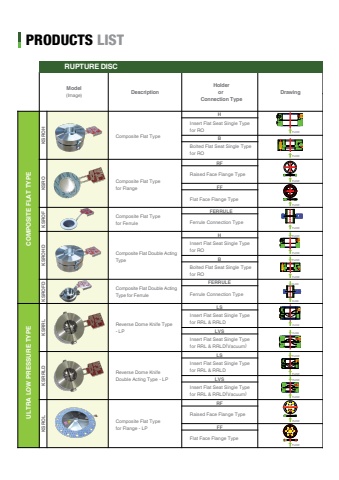 FLOWGas or Vapor LiquidHBRFFFFERRULE HLVSLSLVSRFFFMaxOperating Ratio0.05 ~ 35 kg/%u33a00.05 ~ 35 kg/%u33a0 Set. Pressure0.05 ~ 15 kg/%u33a00.05 ~ 15 kg/%u33a00.05 ~ 15 kg/%u33a0Spark FragmentAvailable Service PhaseYes Yes Yes No No 50% Yes Yes Yes No No 50% Yes Yes Yes No No 50% Yes Yes Yes No No 50% Yes Yes Yes No No 50%Vacuum Support RequiredDescription DrawingKSRO KSROF KSROHD KSROFD KSRRL KSRRLD KSROL KSROHLSBFERRULEULTRA LOW PRESSURE TYPE COMPOSITE FLAT TYPEHolderor Connection TypeFLOW FLOW FLOW FLOW FLOW FLOW FLOW FLOW FLOW FLOW FLOW FLOW FLOW FLOW FLOW FLOWComposite Flat TypeComposite Flat Typefor FlangeComposite Flat Type for FerruleComposite Flat Double ActingTypeComposite Flat Double Acting Type for FerruleReverse Dome Knife Double Acting Type - LPReverse Dome Knife Type- LPComposite Flat Type for Flange - LPInsert Flat Seat Single Type for ROBolted Flat Seat Single Typefor RORaised Face Flange TypeFlat Face Flange TypeFerrule Connection TypeFerrule Connection TypeInsert Flat Seat Single Type for ROBolted Flat Seat Single Type for ROInsert Flat Seat Single Type for RRL & RRLD Insert Flat Seat Single Type for RRL & RRLD(Vacuum)Insert Flat Seat Single Type for RRL & RRLD(Vacuum)Insert Flat Seat Single Typefor RRL & RRLDRaised Face Flange TypeFlat Face Flange TypeFLOW Yes Yes No No No 50% 0.01 ~ 1.0 kg/%u33a0(100 ~ 10,000 mmAq)Yes Yes No No No 50% 0.01 ~ 1.0 kg/%u33a0(100 ~ 10,000 mmAq)Yes Yes No No No 50%Size1/2\(15A ~ 1200A)1/4\(8A ~ 100A) 1/2\(15A ~ 1800A)1S~4SFREEULE 1/2\(15A ~ 1200A) 1/4\(8A ~ 100A)1S~4SFREEULE1/2\~ 10\(15A ~ 250A)1/2\(15A ~ 250A) 4\(100A ~ 800A)0.01 ~ 0.15 kg/%u33a0(100 ~ 1,500 mmAq)RUPTURE DISC Model (Image)FLOWPRODUCTS LIST
