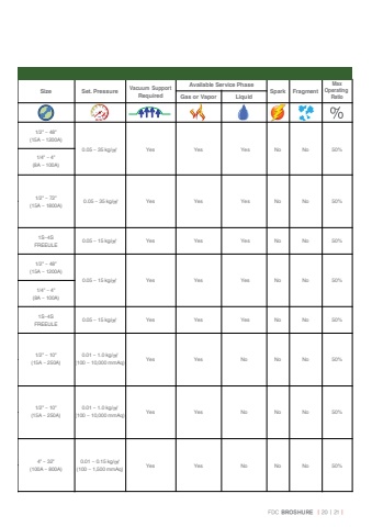FLOWGas or Vapor LiquidHBRFFFFERRULEHLVSLSLVSRFFFMaxOperatingRatio0.05 ~ 35 kg/%u33a00.05 ~ 35 kg/%u33a0Set. Pressure0.05 ~ 15 kg/%u33a00.05 ~ 15 kg/%u33a00.05 ~ 15 kg/%u33a0Spark FragmentAvailable Service PhaseYes Yes Yes No No 50%Yes Yes Yes No No 50%Yes Yes Yes No No 50%Yes Yes Yes No No 50%Yes Yes Yes No No 50%Vacuum SupportRequiredDescription DrawingKSROKSROFKSROHDKSROFDKSRRLKSRRLDKSROLKSROHLSBFERRULEULTRA LOW PRESSURE TYPE COMPOSITE FLAT TYPEHolderor Connection TypeFLOWFLOWFLOWFLOWFLOWFLOWFLOWFLOWFLOWFLOWFLOWFLOWFLOWFLOWFLOWFLOWComposite Flat TypeComposite Flat Typefor FlangeComposite Flat Type for FerruleComposite Flat Double ActingTypeComposite Flat Double Acting Type for FerruleReverse Dome Knife Double Acting Type - LPReverse Dome Knife Type- LPComposite Flat Type for Flange - LPInsert Flat Seat Single Type for ROBolted Flat Seat Single Typefor RORaised Face Flange TypeFlat Face Flange TypeFerrule Connection TypeFerrule Connection TypeInsert Flat Seat Single Type for ROBolted Flat Seat Single Type for ROInsert Flat Seat Single Type for RRL & RRLD Insert Flat Seat Single Type for RRL & RRLD(Vacuum)Insert Flat Seat Single Type for RRL & RRLD(Vacuum)Insert Flat Seat Single Typefor RRL & RRLDRaised Face Flange TypeFlat Face Flange TypeFLOWYes Yes No No No 50% 0.01 ~ 1.0 kg/%u33a0(100 ~ 10,000 mmAq)Yes Yes No No No 50% 0.01 ~ 1.0 kg/%u33a0(100 ~ 10,000 mmAq)Yes Yes No No No 50%Size1/2\(15A ~ 1200A)1/4\(8A ~ 100A)1/2\(15A ~ 1800A)1S~4SFREEULE1/2\(15A ~ 1200A)1/4\(8A ~ 100A)1S~4SFREEULE1/2\(15A ~ 250A)1/2\(15A ~ 250A)4\(100A ~ 800A)0.01 ~ 0.15 kg/%u33a0(100 ~ 1,500 mmAq)RUPTURE DISCModel(Image)FLOWFDC BROSHURE | 20 | 21 |