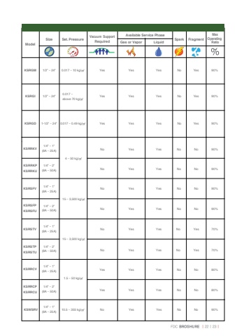 KSRRKP KSRRKUKSRRKPKSRRKUKSRSFVKSRSFVKSRSFP KSRSFUKSRSFPKSRSFUKSRSTVKSRSTVKSRSTP KSRSTUKSRSTPKSRSTUKSRRCVKSRRCV KSRRCP KSRRCUKSRRCPKSRRCUKSRRKVKSRRKVVCR PLUG UNIONFLOW FLOW FLOWFLOWFLOWFLOWFLOWFLOWFLOWFLOW FLOWFLOWFLOW FLOW FLOWMFR StandardUnion ConnectorInlet Screwed Maleor FemaleOutlet Screwed Maleor FemaleMFR StandardScrewed ConnectorStandard VCRConnectorInserted between FlangeInserted between FlangeInserted between FlangeIn/Outlet StandardConnetorIn/Outlet ScrewedMale or Female or Weld neckGas or Vapor LiquidMaxOperatingRatioSpark FragmentAvailable Service PhaseNoNoNoNoNo Yes No 90%YesYesYesYesYesYesYesYesYesYesYesYesYesNo Yes Yes No No 90%No 90%90%90%90%No Yes Yes NoNo Yes Yes No No 90%No Yes Yes 70%No 70%No NoNo NoYes Yes No YesNo YesYes Yes 80%Yes 80%YesYes YesVacuum SupportRequiredForward DomeScored TypeForward DomeTension TypeCompositeDomeFlat Seat TypeReverse DomeShear TypeMono TypeInverted TypeDouble Acting TypeDescriptionFITTING CONNECTION TYPE GRAPHITE DISCConnection TypeSet. Pressure4 ~ 50 kg/%u33a00.017 ~ 10 kg/%u33a00.017 ~ above 70 kg/%u33a00.017 ~ 0.49 kg/%u33a015 ~ 3,500 kg/%u33a015 ~ 3,500 kg/%u33a01.5 ~ 50 kg/%u33a0Size1/4\(8A ~ 25A)1/2\1/2\1-1/2\1/4\(8A ~ 50A)1/4\(8A ~ 25A)1/4\(8A ~ 50A)1/4\(8A ~ 25A)1/4\(8A ~ 50A)1/4\(8A ~ 25A)1/4\(8A ~ 50A)Model ModelImageDrawingKSRGM DrawingKSRGMImageDrawingImageDrawingImageImageDrawingDrawingKSRGI DrawingKSRGIKSRGD DrawingKSRGDRUPTURE DISCKSWSRVReverse Dome KSWSRVScored Type10.5 ~ 355 kg/%u33a0 No Yes Yes No No 90%1/4\(8A ~ 25A)FLOWFDC BROSHURE | 22 | 23 |