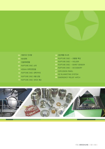 16 %uc0dd%uc0b0%uc81c%ud488 %ub9ac%uc2a4%ud2b826 RUPTURE DISC - %ubaa8%ub378%ubcc4 %ud2b9%uc9d5 32 RUPTURE DISC - HOLDER32 RUPTURE DISC - BURST SENSOR 36 RUPTURE DISC - ACCESSORY37 EXPLOSION PANEL38 N2 BLANKETING SYSTEM39 EMERGENCY RELIEF HATCHFDC BROSHURE | 02 | 03 |04 %ub300%ud45c%uc774%uc0ac %uc778%uc0ac%ub9d006 %ud68c%uc0ac%uc5f0%ud60107 %uc778%uc99d%ucde8%ub4dd%ud604%ud66908 RUPTURE DISC %uc18c%uac1c10 KOSHA %uc758%ubb34%uc548%uc804%uc778%uc99d12 RUPTURE DISC %uc120%ud0dd%uac00%uc774%ub4dc13 RUPTURE DISC %ubaa8%ub378 %uc120%uc81514 RUPTURE DISC %uc0ac%uc774%uc988 %uacc4%uc0b0