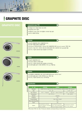 GRAPHITE DISC%u25a0 %ud398%ub180%uc218%uc9c0%uac00 %uc8fc%uc785%ub41c %ud751%uc5f0 %uc73c%ub85c %uc81c%uc791%u25a0 %uc124%uce58%uc640 %uc720%uc9c0%uac00 %uc6a9%uc774%u25a0 %ubcc4%ub3c4%uc758 Holder %uc5c6%uc774 %uaddc%uaca9 %ud50c%ub79c%uc9c0 %uc0ac%uc774%uc5d0 %uc9c1%uc811 %uc124%uce58%u25a0 %ubd80%uc2dd %uc800%ud56d%uc5d0 %ub6f0%uc5b4%ub0a8GRAPHITE DISC %ud2b9%uc9d5%u25a0 %ub0ae%uc740 %ud30c%uc5f4%uc555%ub825%uacfc %uc911%uac04 %ud30c%uc5f4%uc555%ub825%uc5d0 %uc720%ub9ac%u25a0 %ub0b4%uacbd %uac00%uacf5%uc744 %ud55c%uce21%uc774 %uc720%uccb4%uc5d0 %uc811%ucd09%u25a0 Vacuum %uc6b4%uc804%uc870%uac74%uc758%uacbd%uc6b0, 25psig %uc774%ud558 %ud30c%uc5f4%uc555%ub825%uc5d0 %ub300%ud574 Vacuum support %uc801%uc6a9 %uac00%ub2a5%u25a0 221%u2103 %uc774%uc0c1 371%u2103 %uae4c%uc9c0%uc758 %uc11c%ube44%uc2a4%uc5d0 %ub300%ud574 %ud544%uc694%ud55c %ud2b9%uc218 %ud45c%uba74%ucc98%ub9ac %ubc0f Gasket%uc744 %uc81c%uacf5 %u25a0 170%u2103 %uc774%uc0c1%uc758 %uc628%ub3c4%uc5d0 %uc678%uacbd %ubcf4%uac15%ub9c1%uc774 %uc694%uad6c%ub418%uc5b4%uc9d0KSRGM%u25a0 %ub192%uc740 %ud30c%uc5f4%uc555%ub825%uc5d0 %uc720%ub9ac%u25a0 DISK%uc758 %ud3c9%uba74%uc774 %uc720%uccb4%uc5d0 %uc811%ucd09%u25a0 170%u2103 %uc774%uc0c1%uc758 %uc628%ub3c4%uc5d0 %uc678%uacbd %ubcf4%uac15%ub9c1%uc774 %uc694%uad6c%ub418%uc5b4%uc9d0%u25a0 %ub0b4%ubd80%uc2dd%uc131%uc744 %ub192%uc774%uae30 %uc704%ud574 %uc120%ud0dd%uc801%uc778 TFE liner %uc801%uc6a9%uac00%ub2a5KSRGI%u25a0 %uc591%ubc29%ud5a5%uc758 %ud30c%uc5f4%uc555%ub825%uc744 %uc11c%ub85c %ub2e4%ub974%uac8c %uc124%uc815%uac00%ub2a5(Double Acting Type)%u25a0 %ub0b4%ubd80%uc2dd%uc131%uc744 %ub192%uc774%uae30 %uc704%ud574 %uc120%ud0dd%uc801%uc778 liner %uc801%uc6a9 %uac00%ub2a5%u25a0 170%u2103 %uc774%uc0c1%uc758 %uc628%ub3c4%uc5d0 Armor %uc694%uad6c%ub418%uc5b4%uc9d0KSRGDSpecificationGRAPHITE DISC %uad6c %ubd84 KSRGM KSRGI KSRGDStandard ASME Code sec %u2167 KS B ISO 4126, API RP520, KOSHA CODE, FDC standardSize 1/2\1-1/2\Set. Pressure 0.017 ~ 10 kg/cm%u00b2 0.017 ~ above 70 kg/cm%u00b2 0.017 ~ 0.49 kg/cm%u00b2Temperature -179 ~ 371 %u2103 -179 ~ 221%u2103Material GraphiteFragment YesProcess Media Gas, Vapor, LiquidMax. Operating Ratio 90%Spark NOOptionFlouropolymer sintered,Vacuum Support, Insulation,Armor, Gasket, Flouropolymer sintered,Armor, Liner, External TypeVacuum Support, GasketFlouropolymer sintered,Armor, Liner, GasketKSRGDContact FDC for Set. Pressure details corresponding to each sizeKSRGMKSRGI