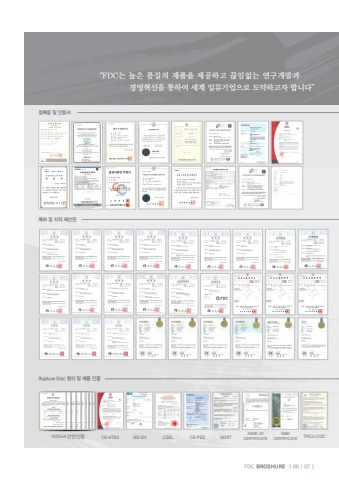 %u201cFDC%ub294 %ub192%uc740 %ud488%uc9c8%uc758 %uc81c%ud488%uc744 %uc81c%uacf5%ud558%uace0 %ub04a%uc784%uc5c6%ub294 %uc5f0%uad6c%uac1c%ubc1c%uacfc %uacbd%uc601%ud601%uc2e0%uc744 %ud1b5%ud558%uc5ec %uc138%uacc4 %uc77c%ub958%uae30%uc5c5%uc73c%ub85c %ub3c4%uc57d%ud558%uace0%uc790 %ud569%ub2c8%ub2e4%u201d%ub4f1%ub85d%uc99d %ubc0f %uc778%uc99d%uc11c%ud2b9%ud5c8 %ubc0f %uc9c0%uc801 %uc7ac%uc0b0%uad8cRupture Disc %ud615%uc2dd %ubc0f %uc81c%ud488 %uc778%uc99dFDC BROSHURE | 06 | 07 |KOSHA %uc548%uc804%uc778%uc99d CE-ATEX IEC-EX CSEL CE-PED GOSTASME UD CERTIFICATENBBI CERTIFICATE TRCU-COC