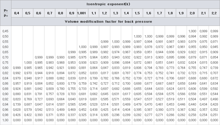 亚临界流动中因背压增加导致理论容量减少的修正系数 (参见表2 背压容量修正系数) |